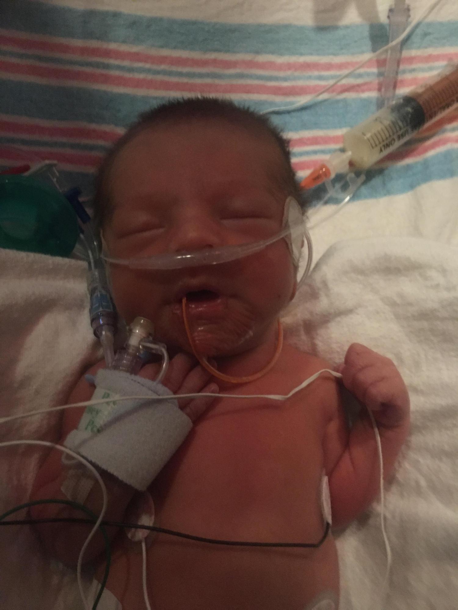 He is currently in the NICU working on lung development, body temperature and sucking/swallowing skills. Right now his feeding is done through his nose. We hope to get him home as soon as possible, but he could be there until my original due date.