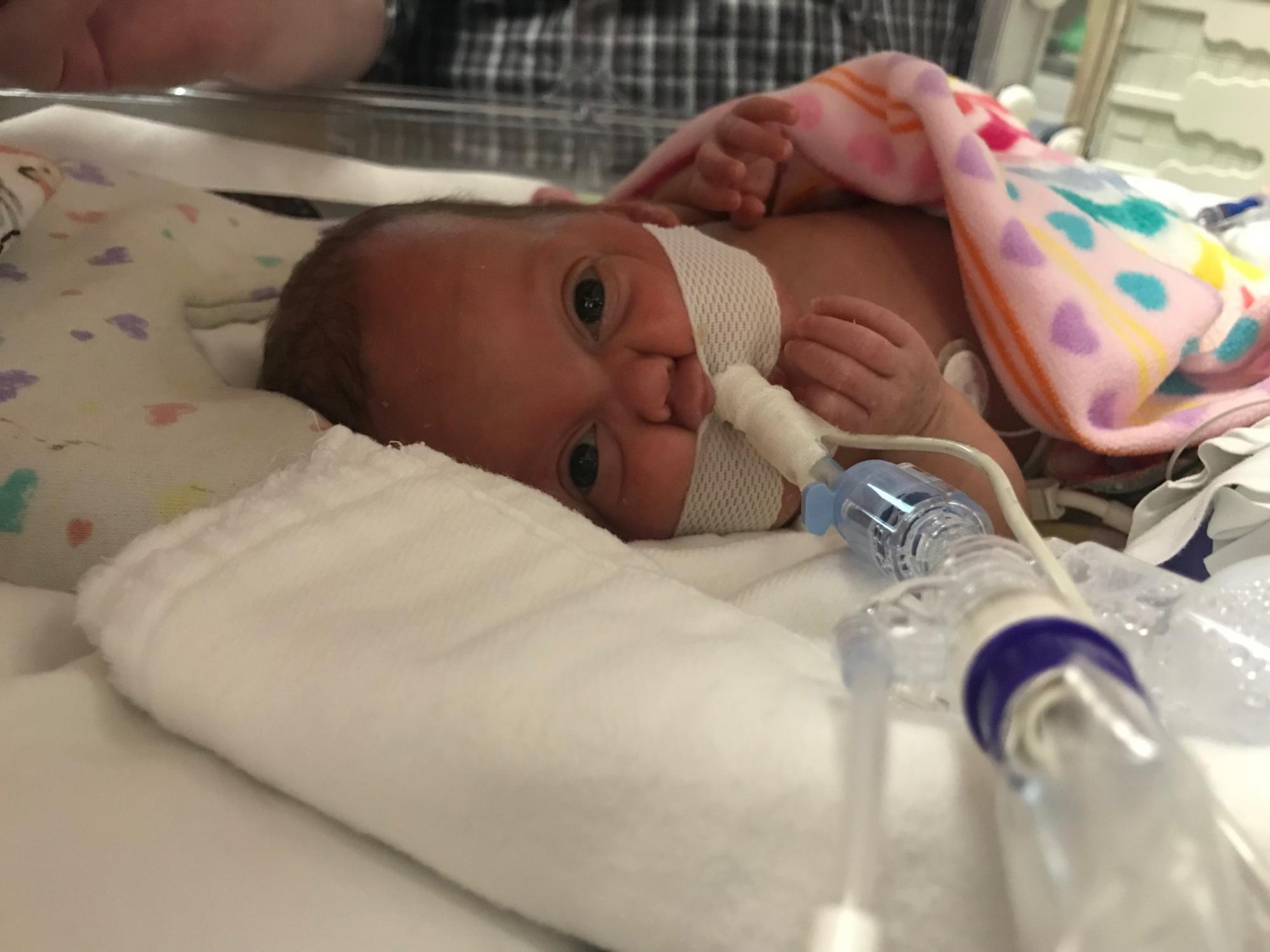 After going in for a follow up ultrasound from my 20 week it was discovered that I was starting to dialate and had a protruding bag. Just before 1am our twin girls were born at 24 Weeks via c-section. Within the first week one of our girls had a bowel perforation and needed emergency surgery to place drain tubes and flush her abdomen. Since then she has required 2 additional surgeries, a PDA ligation in her heart and close a valve in her heart and bowl surgery on a stricter that formed in her intestine from the perforation, resulting in an ostomy. Her incision site became infected and took weeks to heal. She will still need another surgery to reconnect her bowel. Our other daughter ended up getting very sick with late onset group b step sepsis which caused her to get bacterial meningitis. After fighting this infection for over a week an mri was done to determine how much damage the meningitis had caused. She suffered extensive brain damage and passed away due to this.
